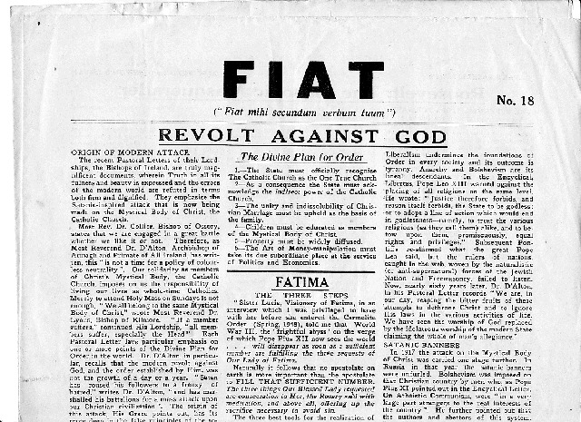 Cover of Fiat Issue No. 33. (1954). Most of the issue addresses the topic of the Irish Constitution and Article 44: "It has been stated frequently in Fiat that Article 44 ... is irreconcilable with the teaching of Papal Encyclicals on the true relationship between Church and