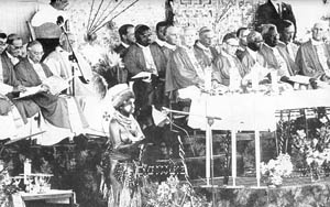 "Afro" Mess during which people dressed as African "gods" and "goddesses", while a pagan priestess acted as an acolyte of the presbyter |