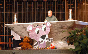 "Sponge Bob" Mess in which a Sponge Bob cartoon figure decorates the Novus Ordo "sanctuary" |